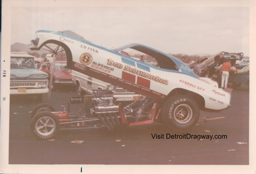 Don Schumacher raced at Detroit Dragway. He started racing in the early 60’s and retired from racing in 1974. In 1998 he established DSR (Don Schumacher Racing) DSR now has a number of funny cars & dragsters that race at every NHRA race.